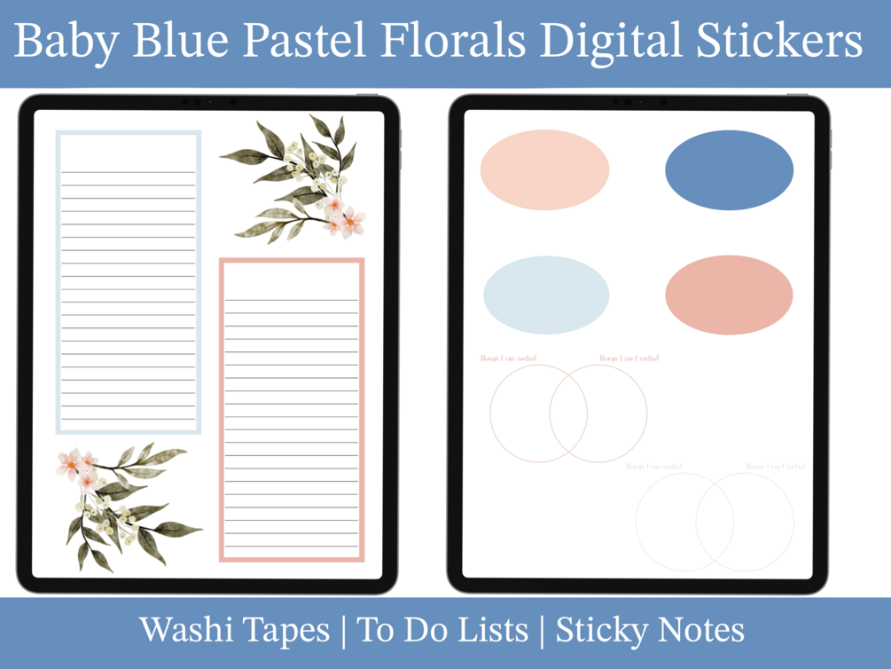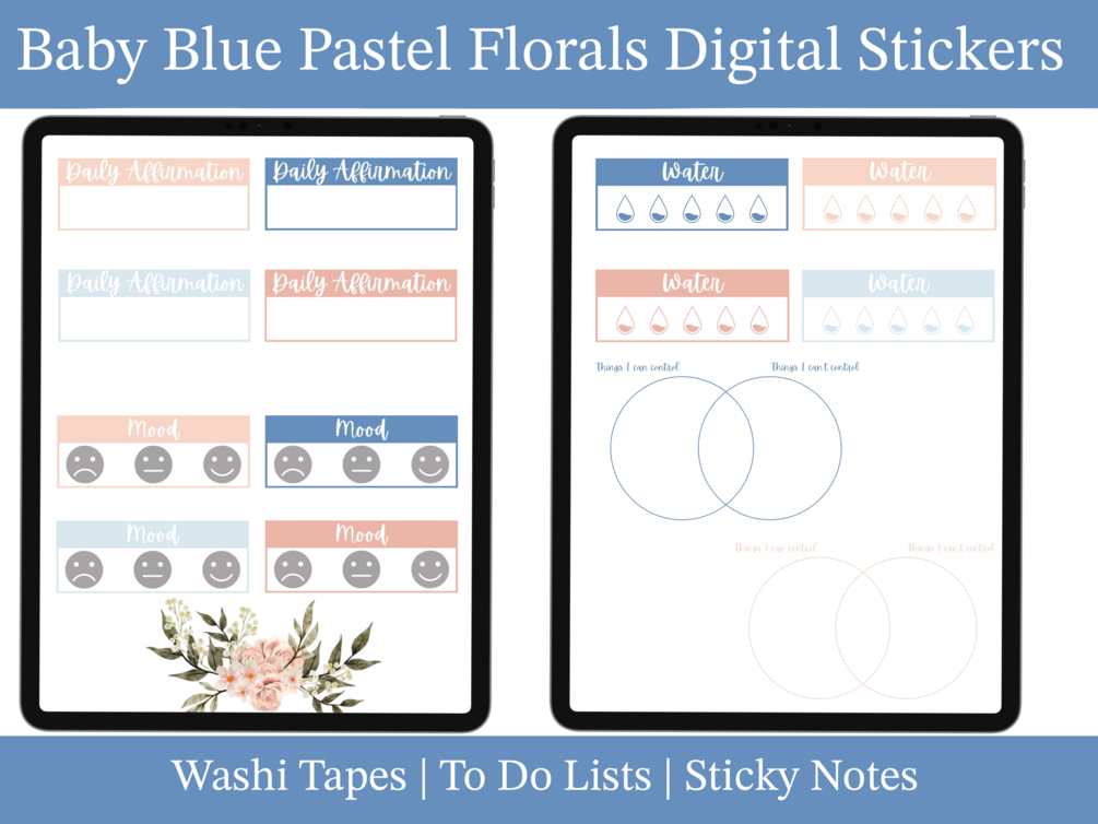 Specifically designed and formatted for use with the popular note-taking app GoodNotes 5, this pack includes a wide range of pastel blue and pink themed elements such as days, months, sticky notes, washi tape, ovals, mental health Venn diagrams, daily affirmations, water intake trackers, mood trackers, notepads, and watercolor-themed florals. The transparent background and pre-cropped stickers make it easy to add them to your digital notes hassle-free.